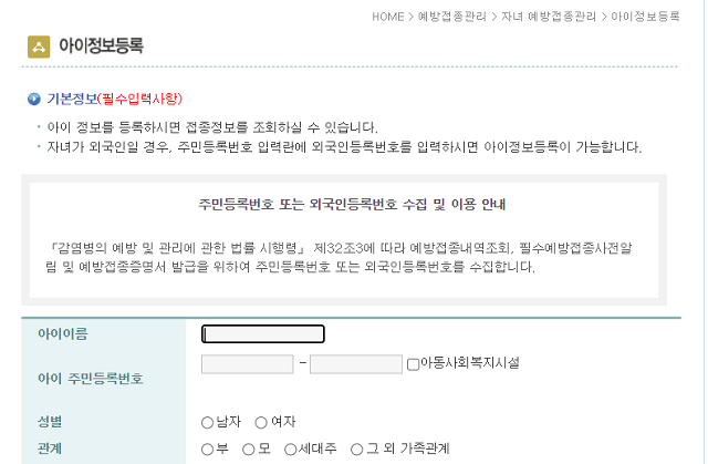 홈페이지 상단 메뉴에서 ‘예방접종관리 > 자녀예방접종관리 > 아이정보등록’을 선택하여 먼저 자녀 정보를 등록해야 합니다.