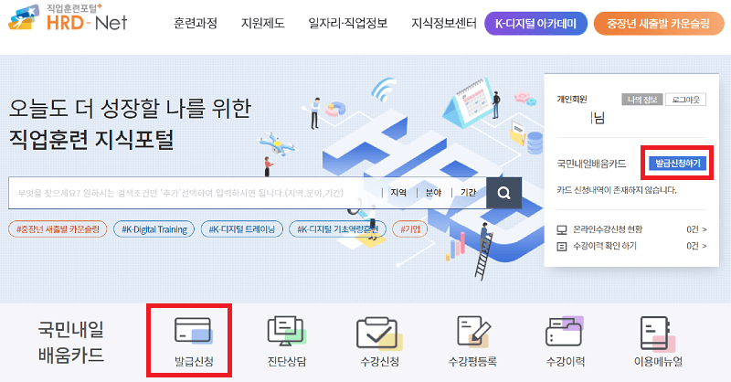1) 직업훈련포털 HRD-NET(https://www.hrd.go.kr/)에 접속하여 로그인 한 뒤, 화면 하단의 '발급신청' 아이콘이나 아니면 오른쪽에 있는 '발급 신청하기' 버튼을 누릅니다.