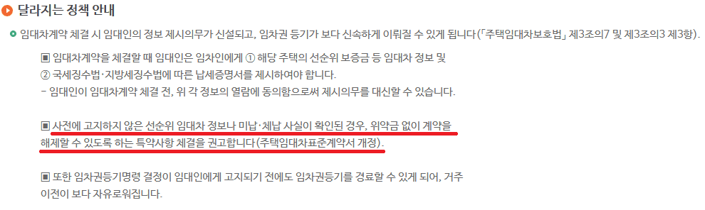 아래 그림에서 보시다시피 개정된 주택임대차 표준계약서에서는 특약사항에 이 같은 내용을 넣어 놓았습니다. 만약 임대인이 이 내용을 특약으로 넣고자 하는 것에 반대한다면 뭔가 이상하다고 생각하고 계약하는 것을 좀 더 신중하게 생각하시길 바랍니다. 내 돈은 소중하니까요.